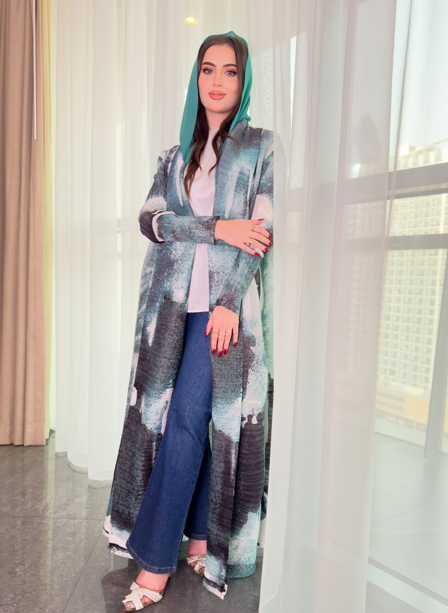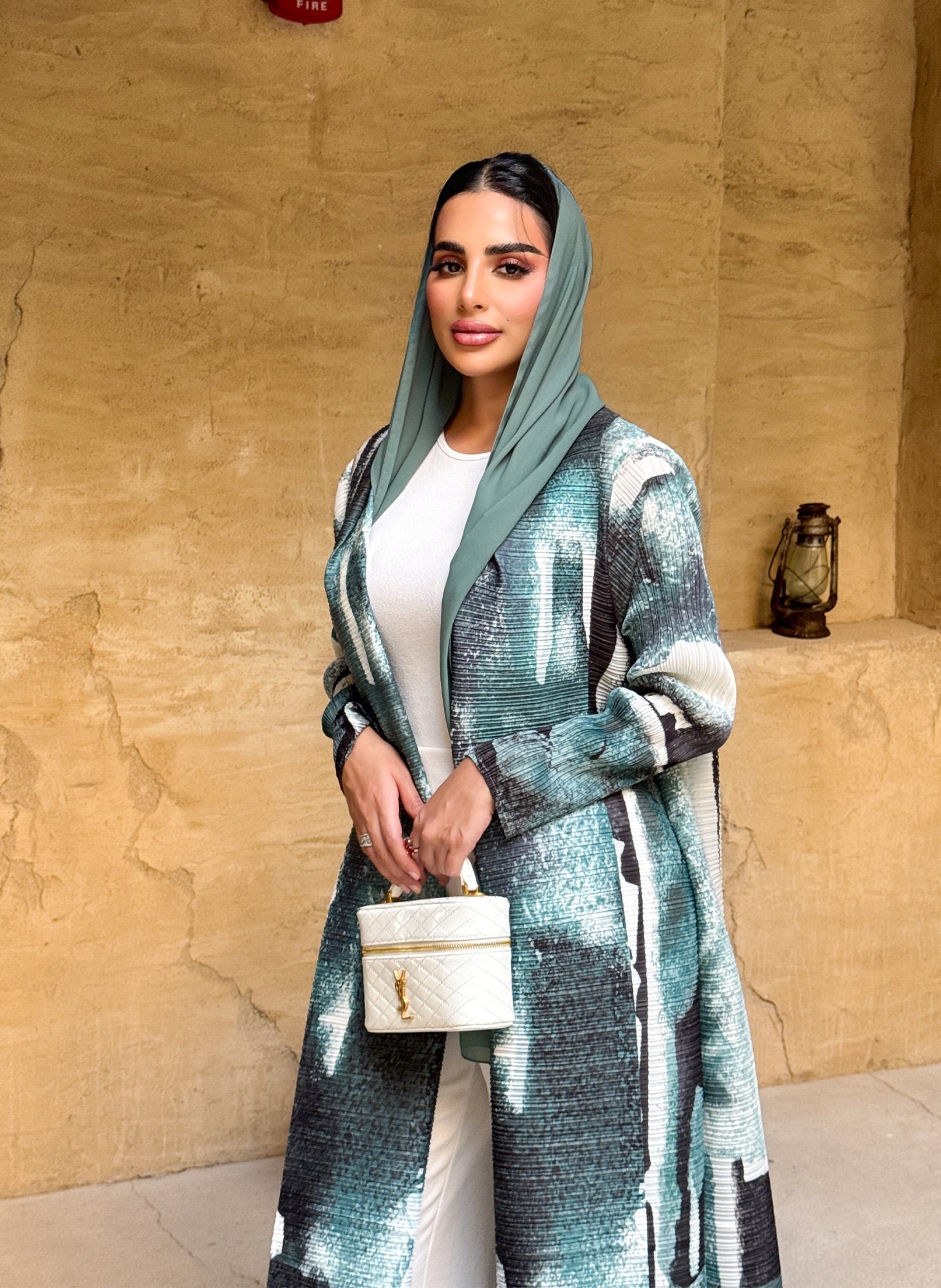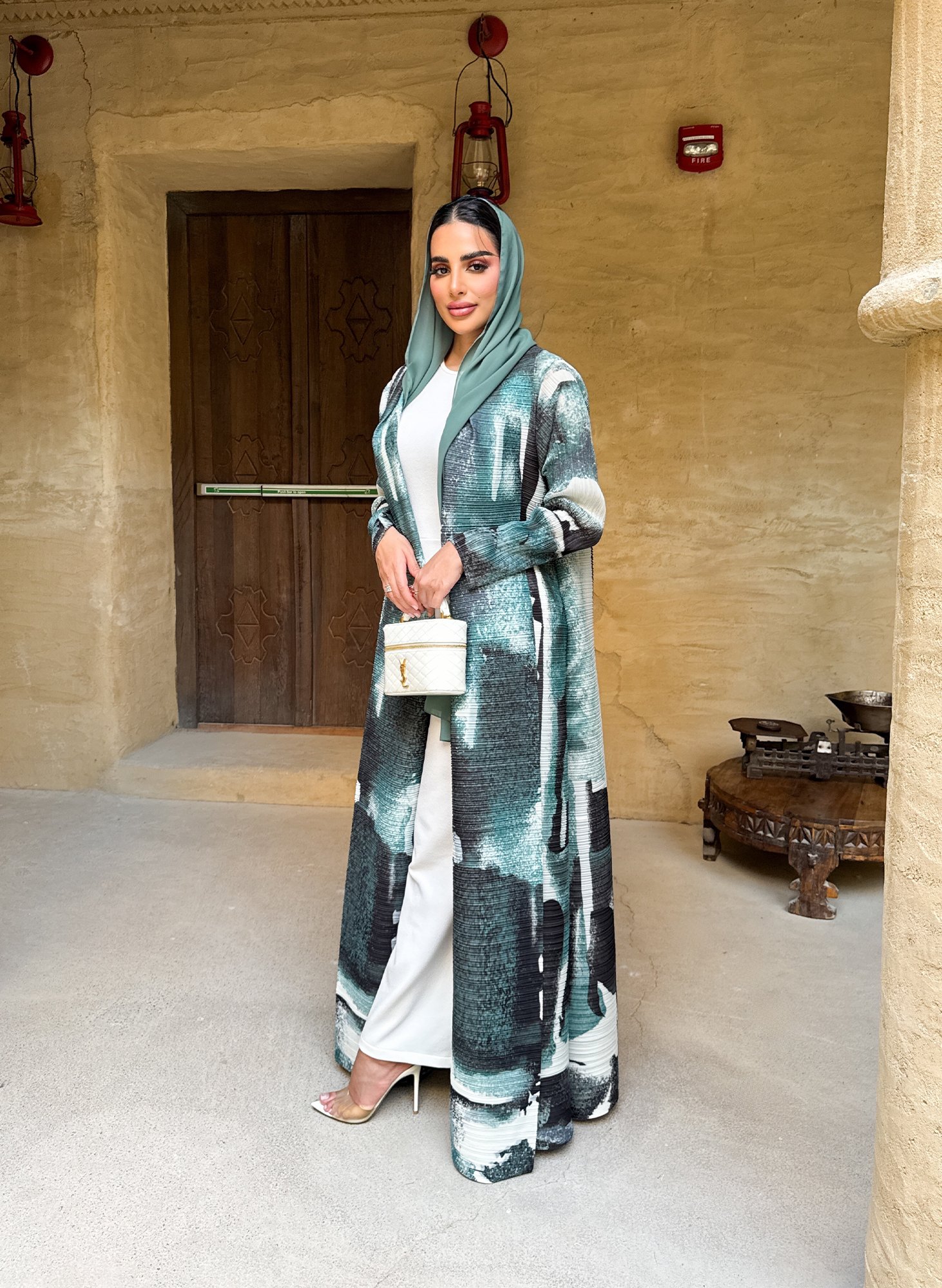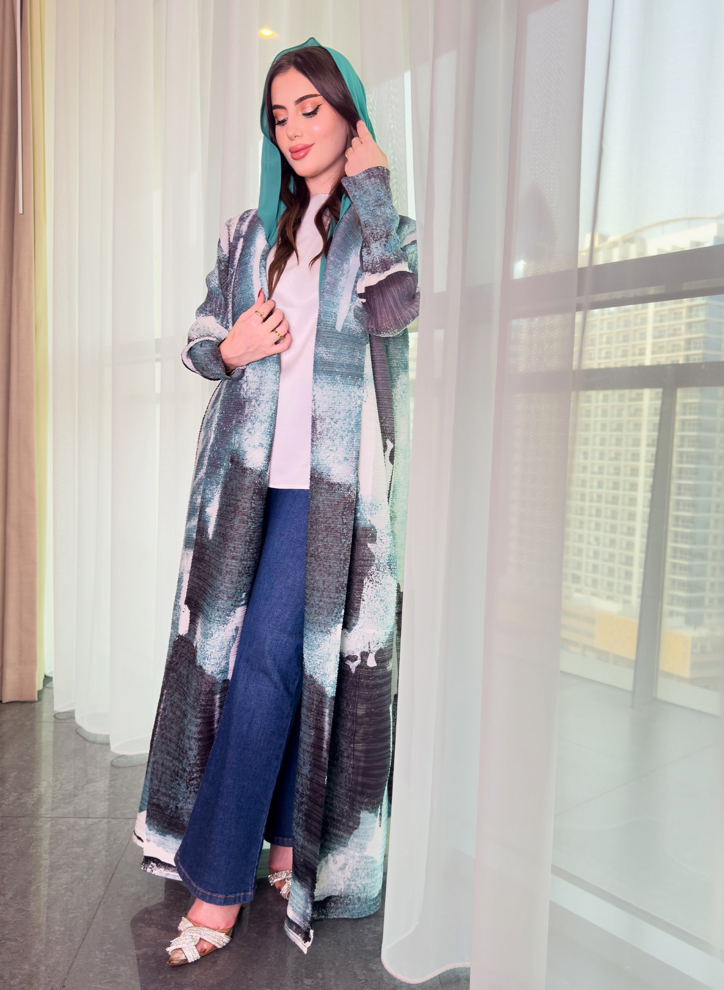 Elevate your everyday style with this pleated abaya featuring an exceptional art-inspired print in shades of teal, black, and soft white. The abstract design showcases individuality while remaining effortlessly chic, making it a standout addition to your wardrobe. Whether you’re heading out for a casual day or attending a stylish gathering, this abaya delivers the perfect balance of sophistication and comfort.